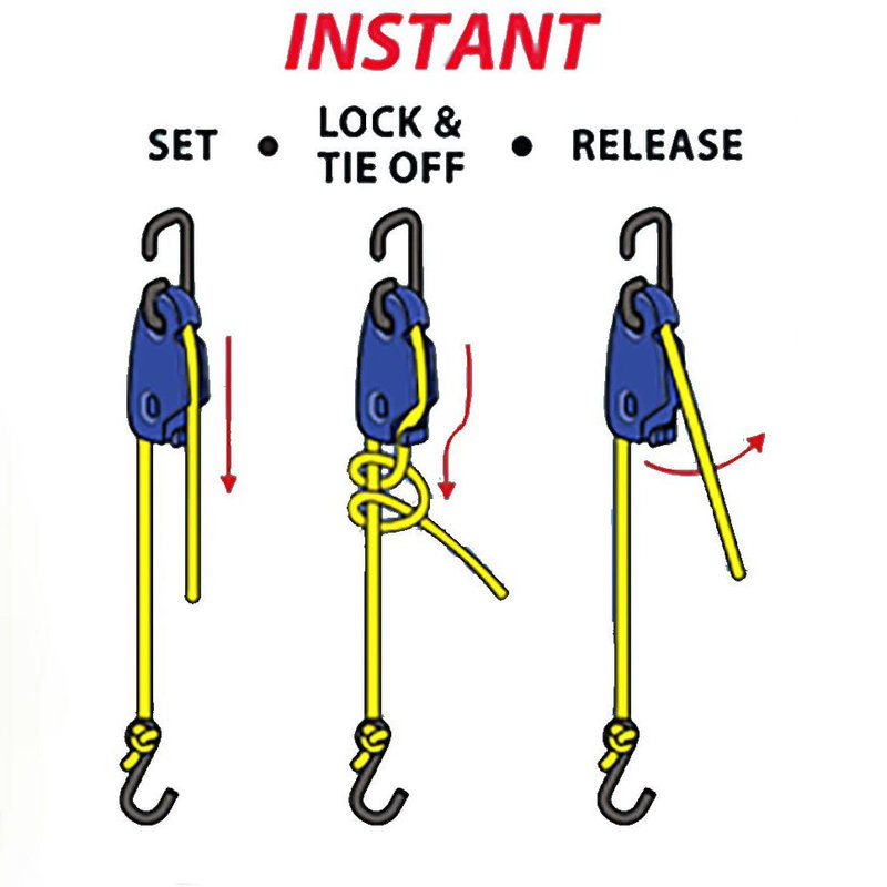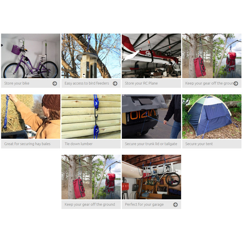 The patented design of the housing ensures the rope will not stretch or snapback while in use, and the items are engineered to set, lock, and release with just one hand.